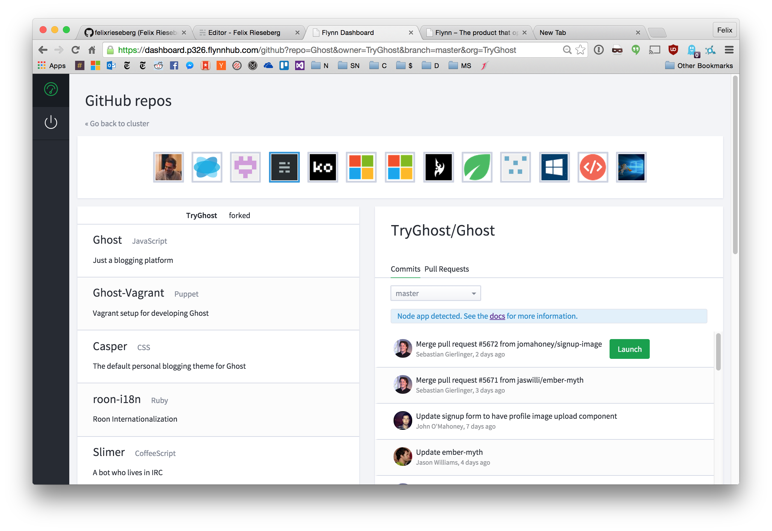 Once installation has completed, the Flynn Installer will ask you install a SSL root certificate used to encrypt the connection between you and your Flynn cluster. It will also give a URL and a passkey to the Flynn dashboard for your cluster, which should look like https://dashboard.p326.flynnhub.com. From there, deploying applications is crazy easy: You can connect the dashboard with GitHub and deploy and scale any application.