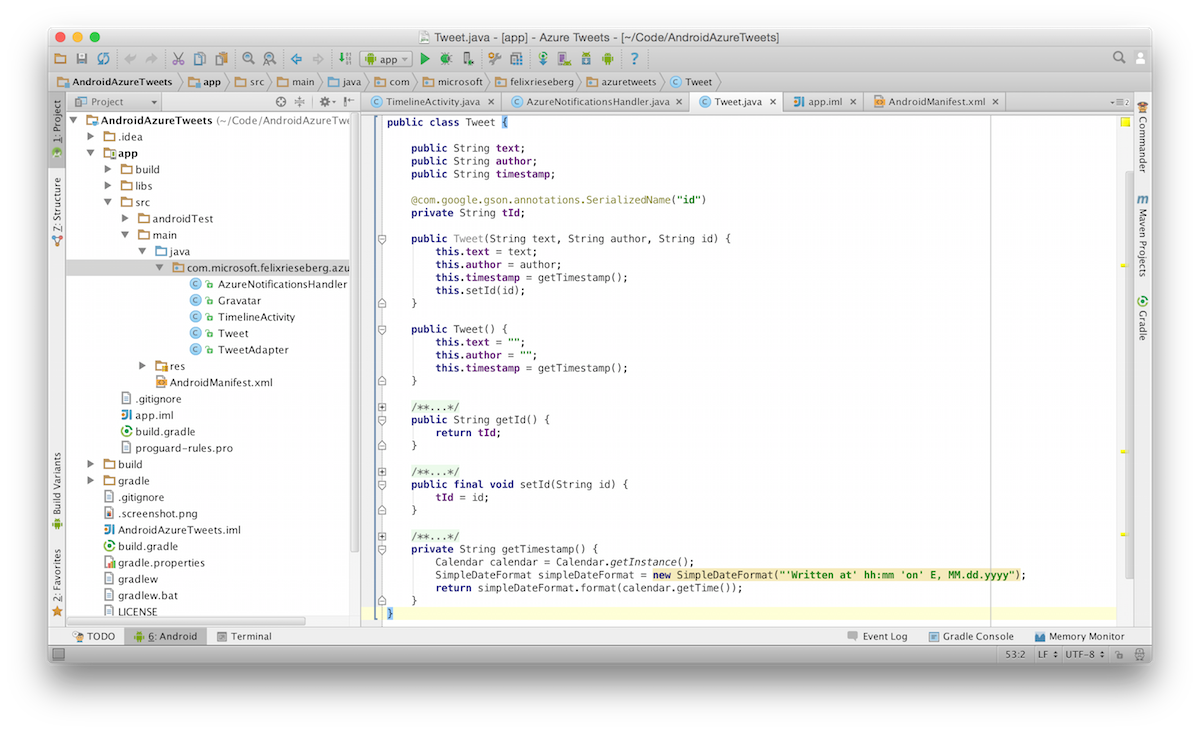 Let's start with the class for the tweets. I'm keeping things simple here: Each tweet has an id, an author, a message, and a timestamp. Text, author and timestamp will just be simple Strings, while I'll follow good coding practice and enable the id to be get and set with methods called getId() and setId().